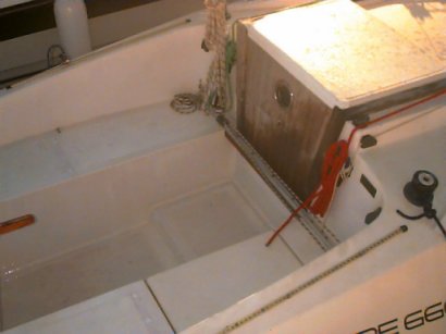 Quando la barca è al riposo, ancorata o all'ormeggio, tenevo il paranco della scotta della randa incocciato su uno degli anellini del pulpito di poppa, a destra o sinistra a secondo della convenienza; questo consentiva di avere molto più spazio in pozzetto.