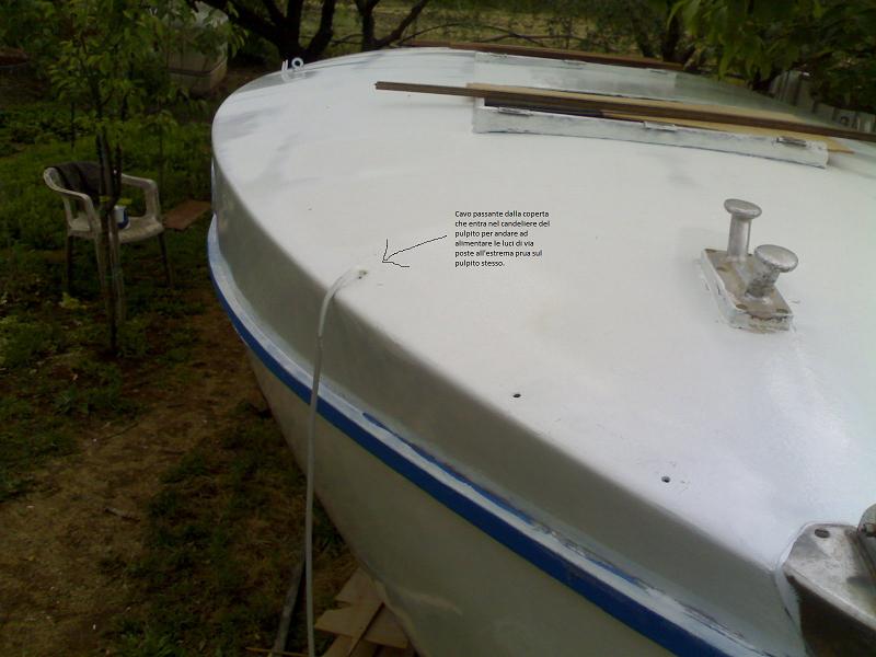 Salve a tutti, nelle foto postate dal sempre gentile Gabri si vede la soluzione adottata su Bithia, mentre la luce a 360° è istallata in testa d'albero e comandata da un interruttore separato (fonda) funziona anche come luce di via,sia unica, come la normativa consente alle barche piccole e lente (se ben ricordo sotto i sette nodi).Sia associata alle luci rosso/verde istallate sul pulpito di prua, con una piastrina inox fissata in due fori eseguiti e filettati. Il cavo esce in coperta dalla cabina di prua in corrispondenza del candeliere del pulpito (opportunamente forato al centro), sale al suo interno e ne fuoriesce a meno di un centimetro dell'incrocio con il pulpito vero e proprio, per rientrarvi subito dentro ed uscire sulla verticale della prua.Con un filo di ferro sottile è stato facile guidare il cavo attraverso questi fori ed il risultato finale e di vedere circa tre cm di cavo nella sua guaina uscire e rientrare appunto nell'incrocio candeliere/pulpito.Premetto sempre che l'estetica nei miei lavori è di secondaria importanza ma....questa volta credo di poter dire che non è venuto male. Buon vento a tutti. P.S. per il tipo di fanale rosso/verde che ho montato, non sono reperibili lampade a led......qualcuno ha risolto artigianalmente?????. |