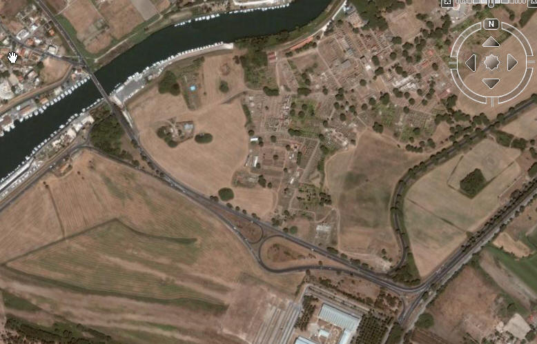 La prima foto si capisce chiaramente che è presa da Google Earth, la strada che viene da destra, quella più in alto viene da Roma, facendo la Via de Mare, andando dritti dopo il semaforo di Ostia Antica, che poi è anche l'unico dopo Tor di Valle.