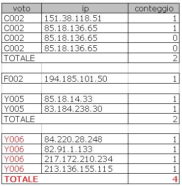 Finora abbiamo votato in 9: uno ha votato tre volte (i voti sono anonimi si rileva solo l'ID del pc), per fortuna allo stesso modo per cui sarà valido un voto. Aspetterei ancora la serata per aprire l'urna e scoprire il primo escluso. Poi visto che i loghi proposti sono tanti, proporrei di consentire al secondo turno a tutti di votare 4 volte per l'esclusione di 4 loghi diversi e quindi elimarne non solo uno, ma 4. Spero sia possibile (lo è Gabri?).